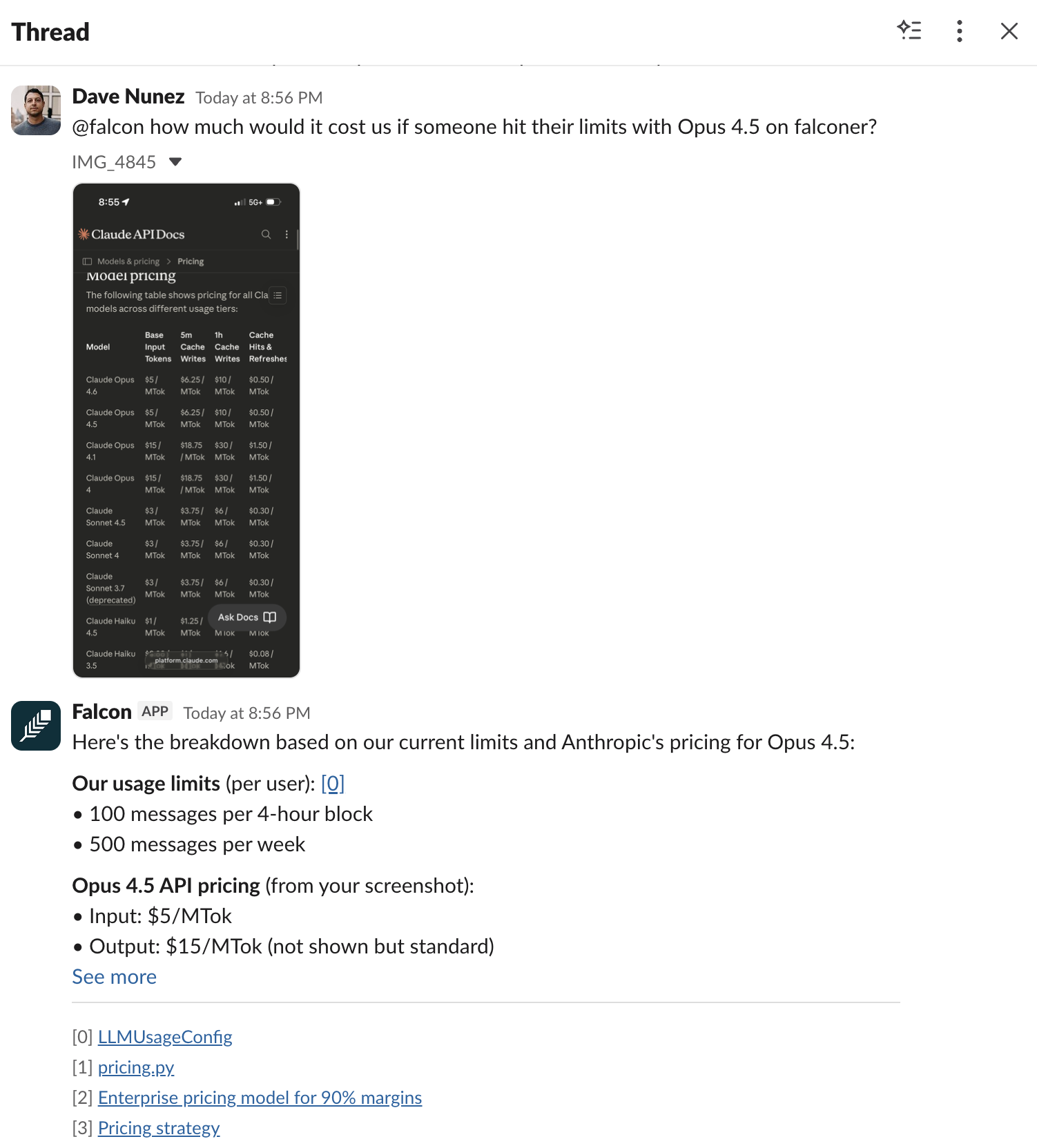 Section titled “Add Falcon to a channel”Mention @Falcon in any channel where the bot is present to ask questions. Falcon responds with answers grounded in your knowledge base, including citations to source materials. You can also DM with Falcon or add it to a group DM.