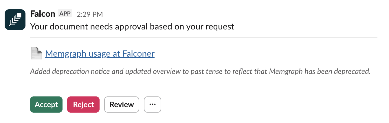 Section titled “How it works”When a PR merges, Falconer analyzes the code changes, identifies which documents are affected, drafts proposed updates, and notifies the right people. Owners can accept, review, or reject changes without leaving Slack.