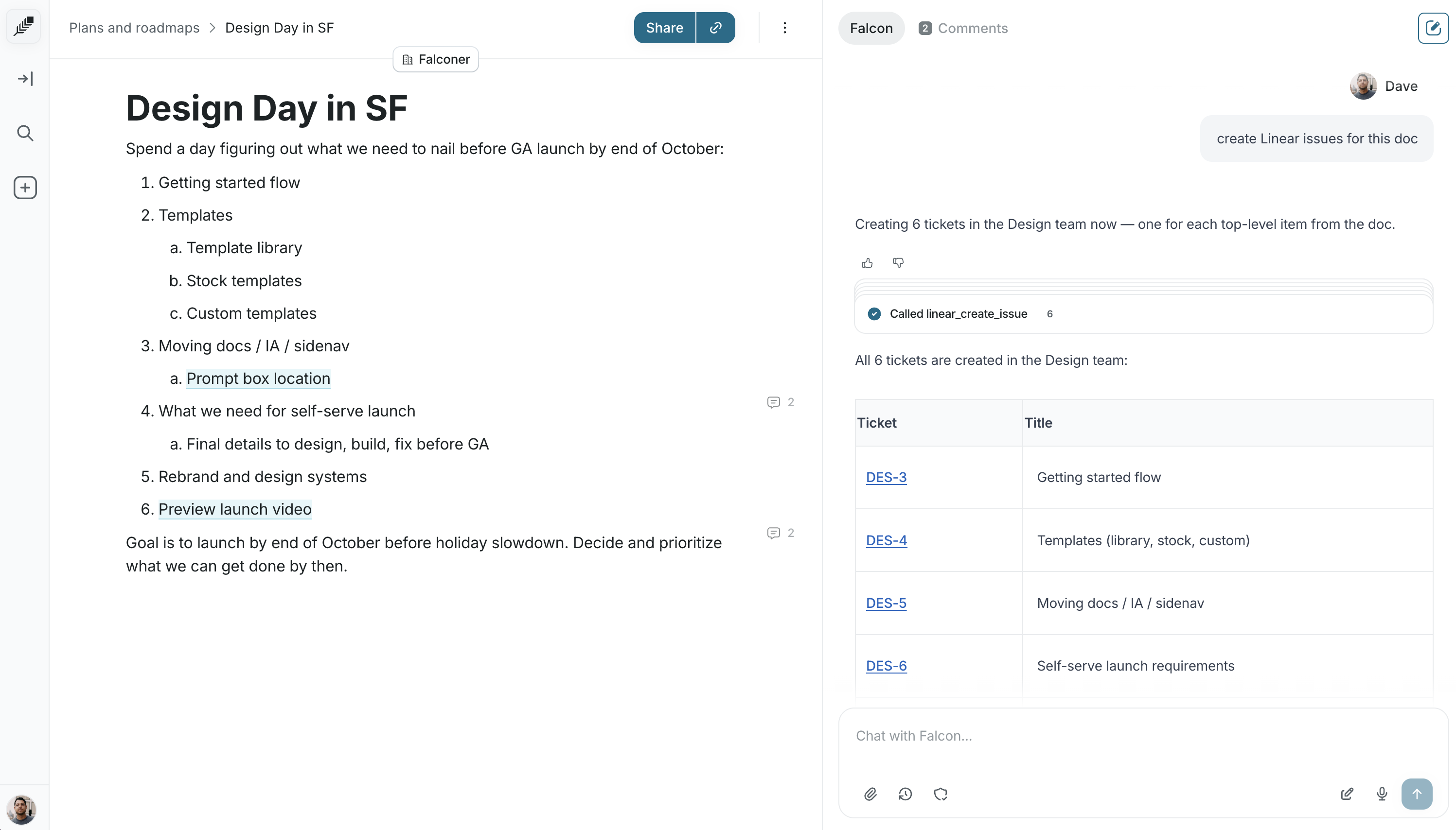 Section titled “Create issues from a doc”You can ask Falconer to create multiple issues from a single message. Falconer analyzes the document and generates individual issues for relevant items: