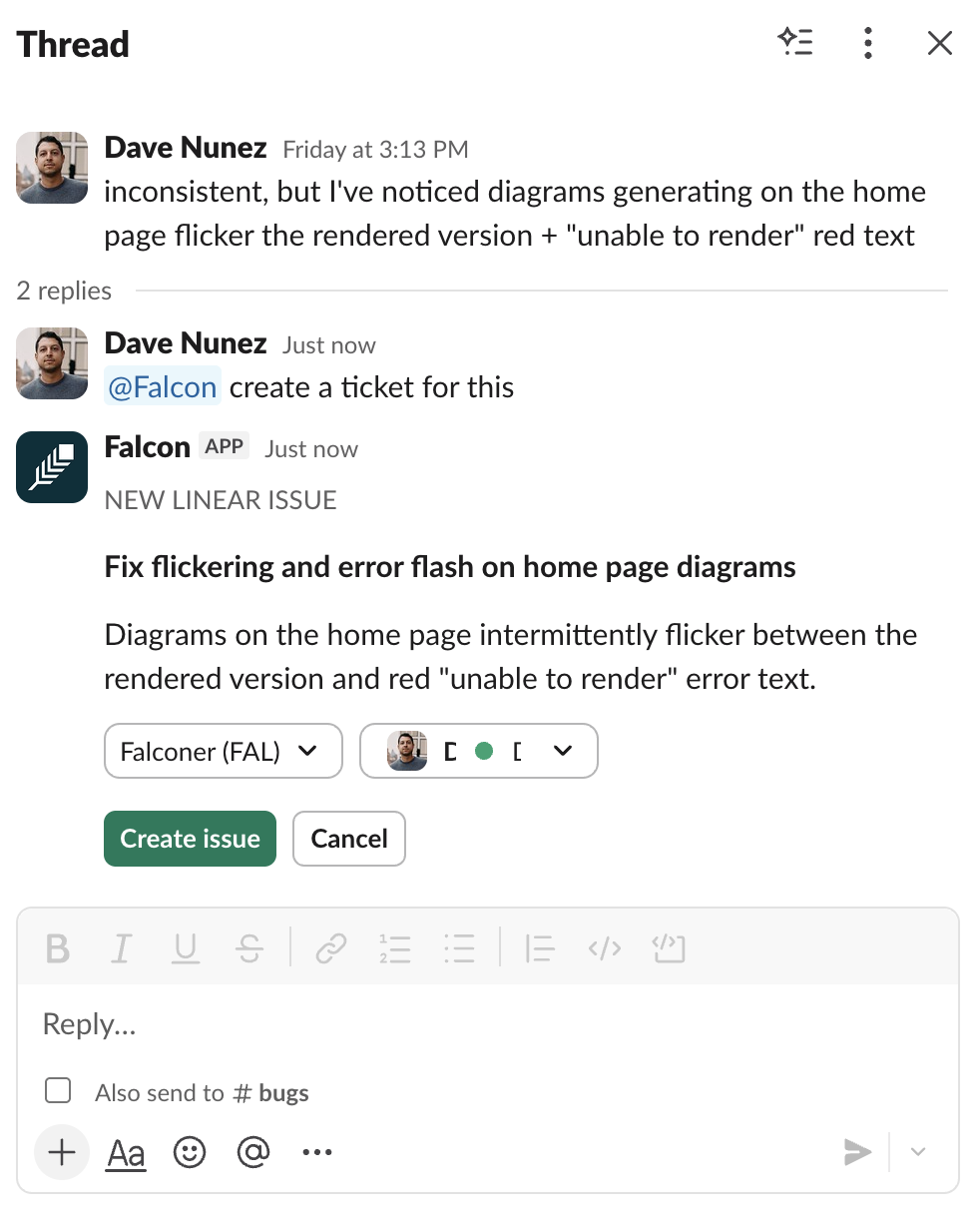@falcon create a ticket for this bug@falcon file a task for me to follow up on this@falcon turn this thread into a Linear issueFalconer generates a preview message in the thread to confirm project and assignee:
