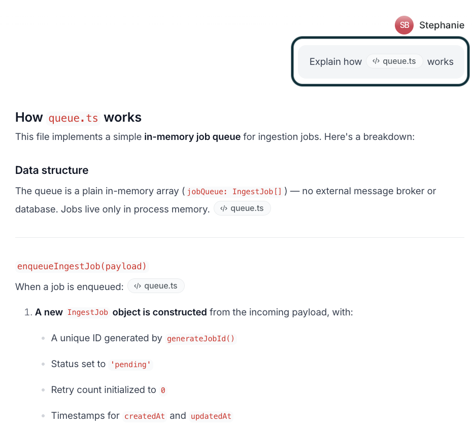 Ask Falconer to explain how any part of your codebase works — from high-level system architecture down to how a specific feature is implemented. Falconer reads your connected repositories and synthesizes answers with citations to the actual files.