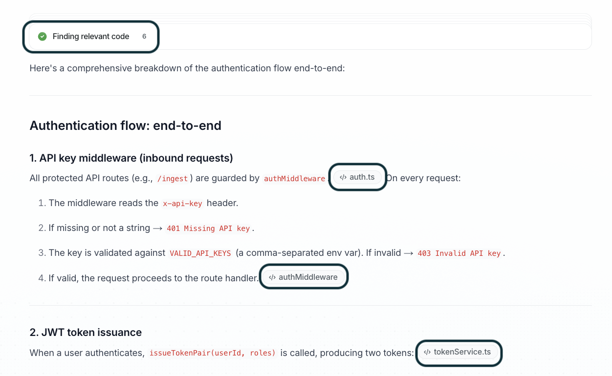 Give me an overview of how this codebase is structuredHow does our authentication flow work end-to-end?Explain the relationship between our API gateway and the services behind itFalconer searches across your connected repositories, synthesizes an explanation, and cites the specific files and functions it drew from.