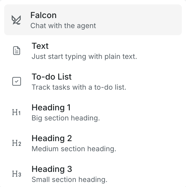 - @ documents — Link to other Falconer docs. Hover over a reference to preview its content.