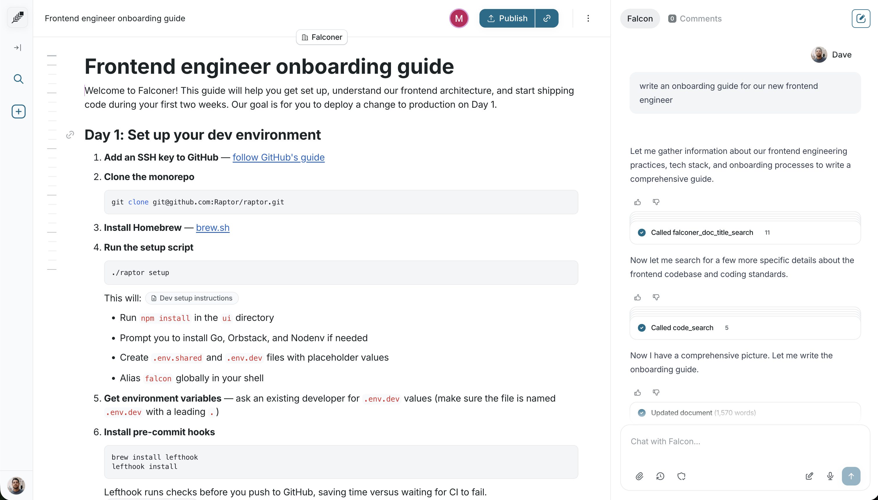 Falconer’s editor combines rich text formatting with AI assistance. Reference your code, tasks, and existing docs while you write — and use inline AI to handle the grunt work.